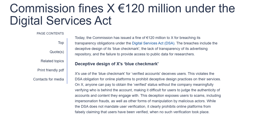根據公報,處罰X有三個原因:X的“藍標認證”僅通過付費即可獲得,在界面設計上對用戶具有誤導性;X的廣告資料庫在透明度和可訪問性方面均不合規(guī);X未按規(guī)定向符合條件的研究人員開放平臺公共數據訪問權限。