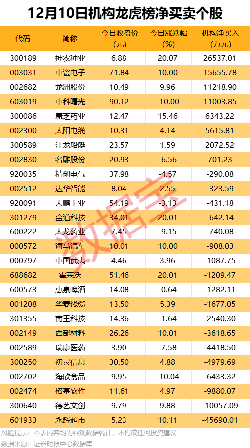 今日龍虎榜中,凈買入個股有8只,凈賣出的個股為18只。4股凈買入金額均超1億元,神農(nóng)種業(yè)獲機構(gòu)凈買入2.65億元,居首;其次是中瓷電子、龍洲股份、中科曙光,機構(gòu)凈買入金額分別為1.57億元、1.12億元、1.1億元。