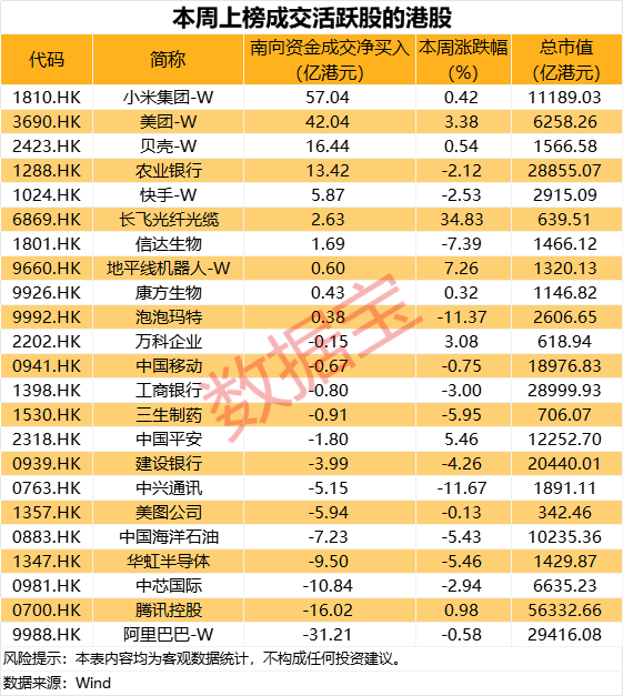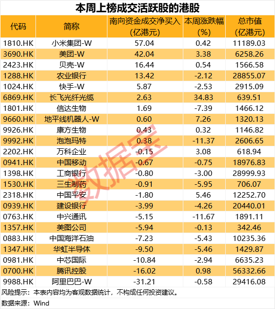 從行情上來看,成交活躍股本周以下跌為主,長飛光纖光纜漲幅居首,一周上漲34.83%,地平線機器人-W、中國平安、美團-W隨后,一周分別上漲7.26%、5.46%、3.38%,中興通訊、泡泡瑪特跌幅居前,分別下跌11.67%、11.37%。