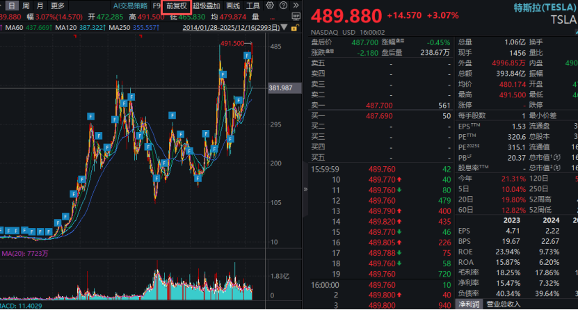 特斯拉表現(xiàn)突出,收盤漲超3%,其復(fù)權(quán)價(jià)一舉創(chuàng)出歷史新高。